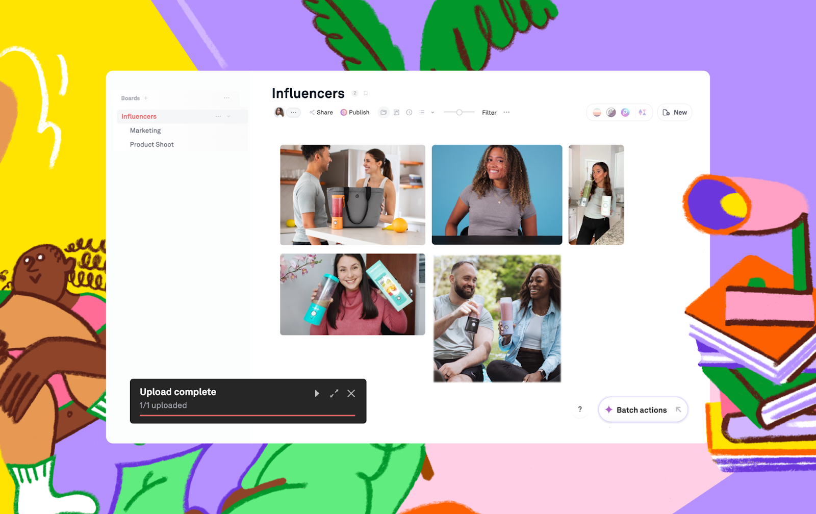 Playbook has made collaborating with influencers significantly easier. When Zoe onboards a new creator, she immediately makes a folder with their name on it. The creator is added as a collaborator and the folder is only for the content they produce. The creator can then manage that folder by dragging and dropping their content into the folder. Once the content is uploaded, it can be shared with anyone on the team or even teams outside of BlendJet — all with just one link.