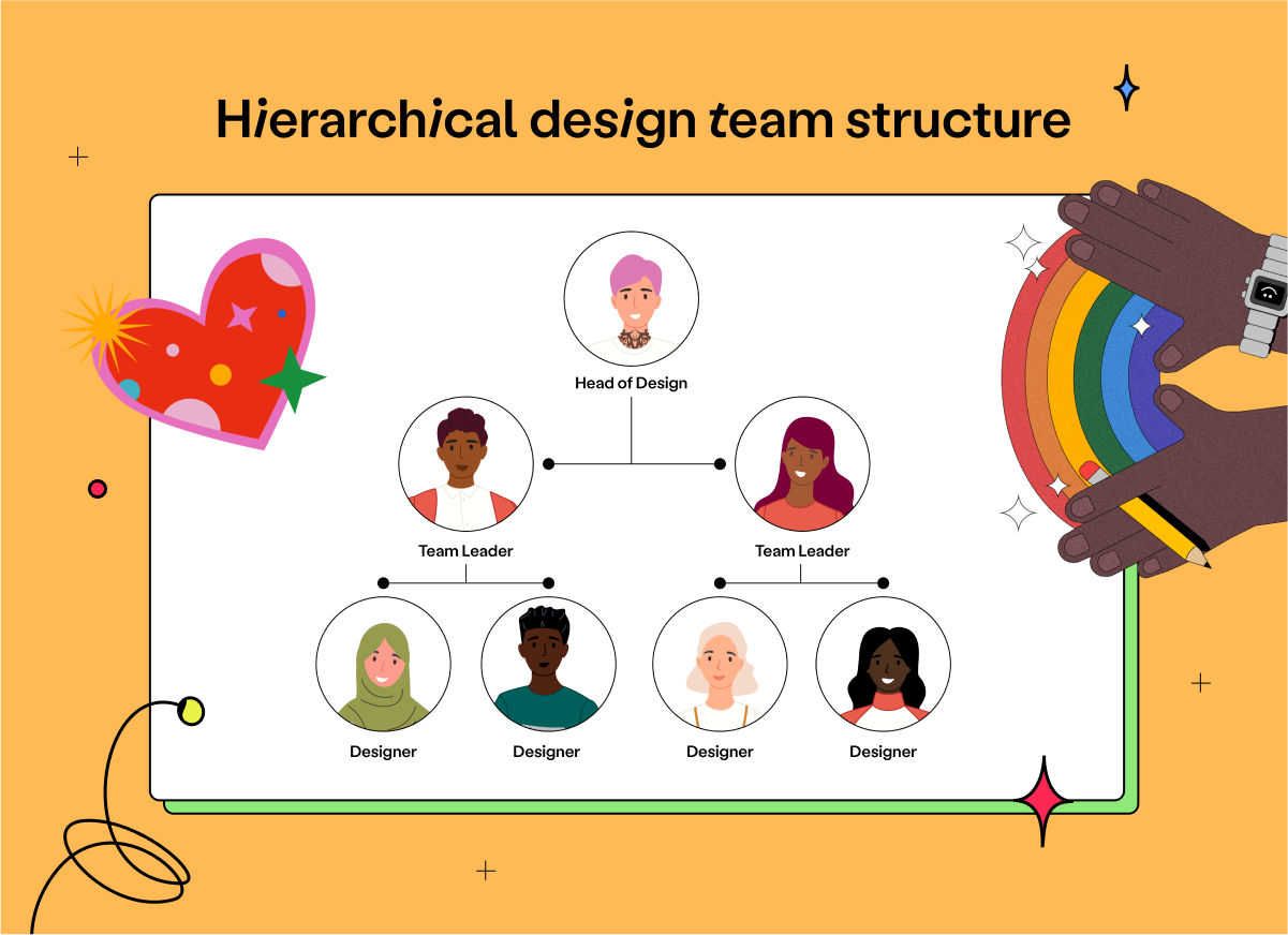 A hierarchical design team structure follows a traditional organizational hierarchy with clear levels of authority and reporting lines. It may include design managers, team leads, and individual designers, for example. The hierarchical structure is often effective for large design teams, where clear lines of communication and management are crucial.