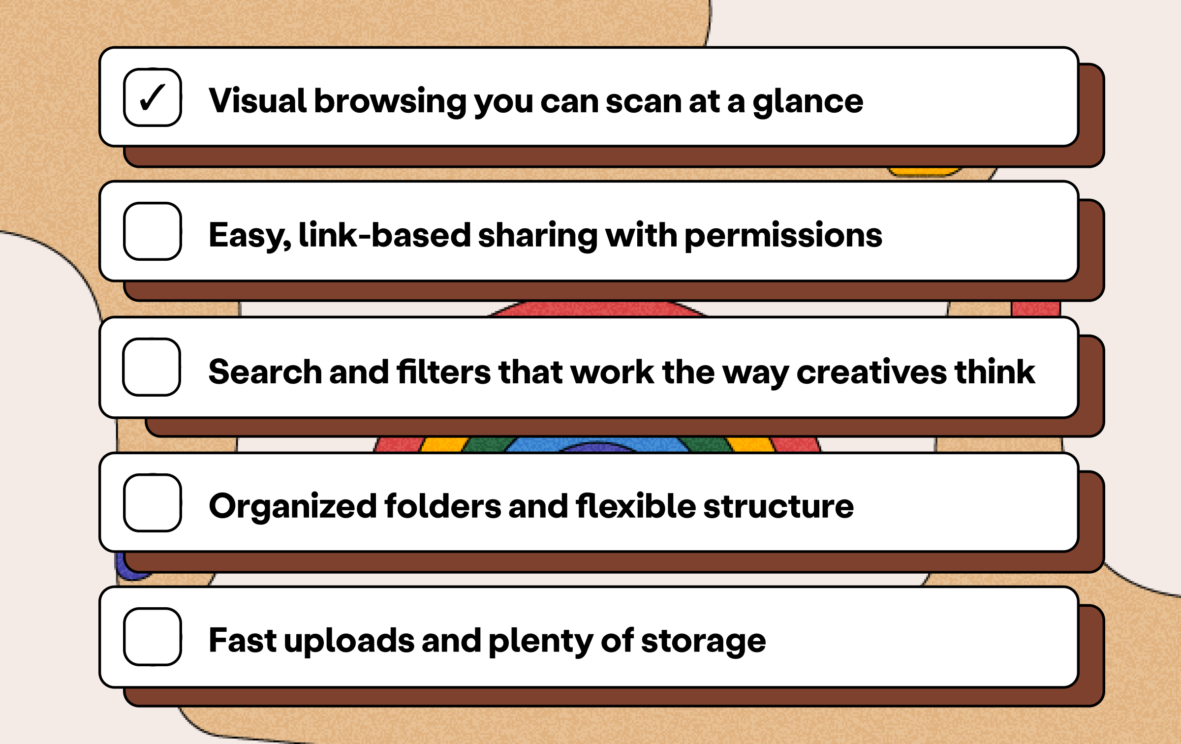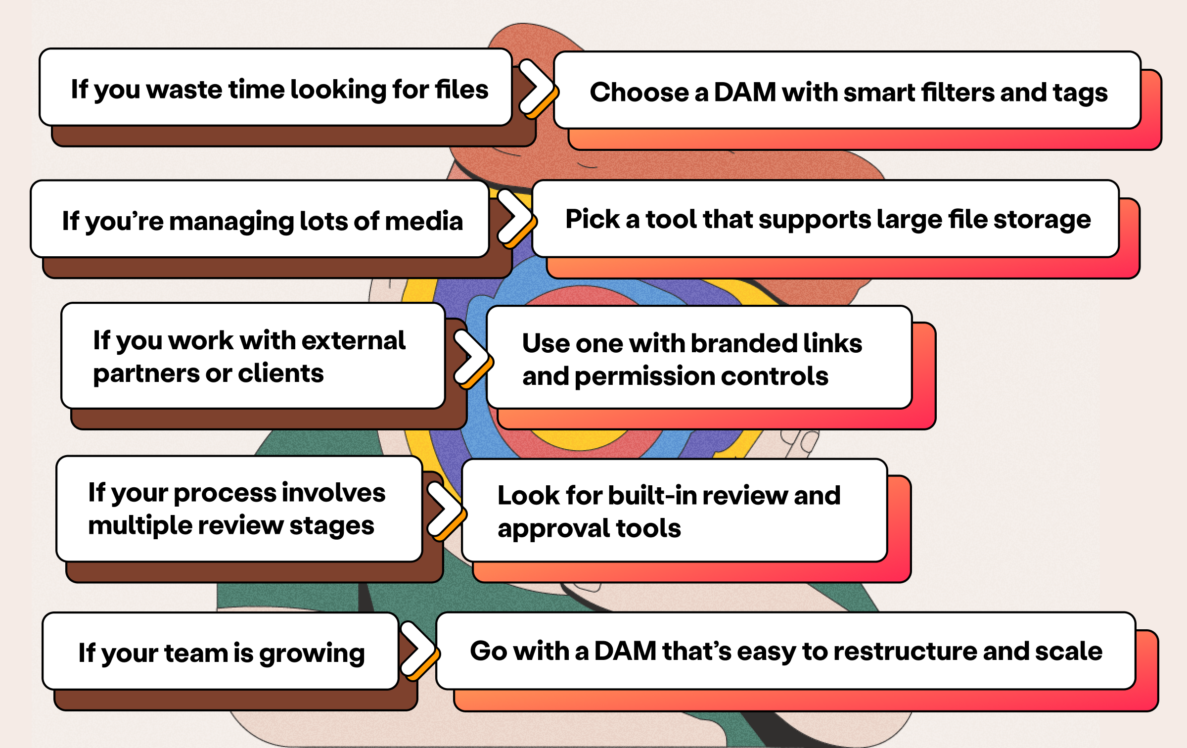 Choosing the right DAM platform starts with understanding where your team feels friction. Look at how your team works today, and what slows them down. Then match those needs to specific features.