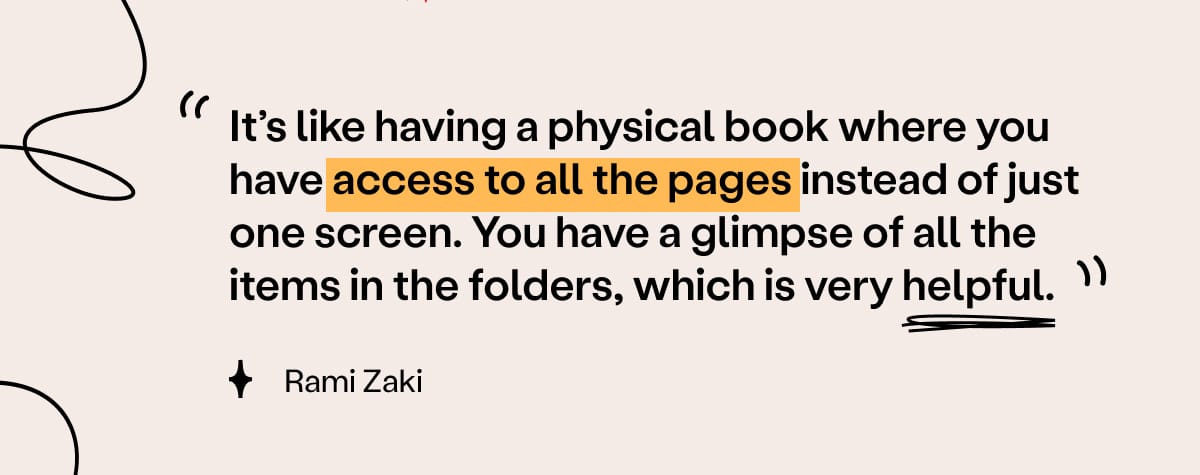 “I love it in terms of the layout of the subfolders, they’re not like the solid folders in Google Drive — they’re much more scannable,” says Rami, who uses subfolders to categorize and access visual assets, ensuring his team stays aligned on brand direction.