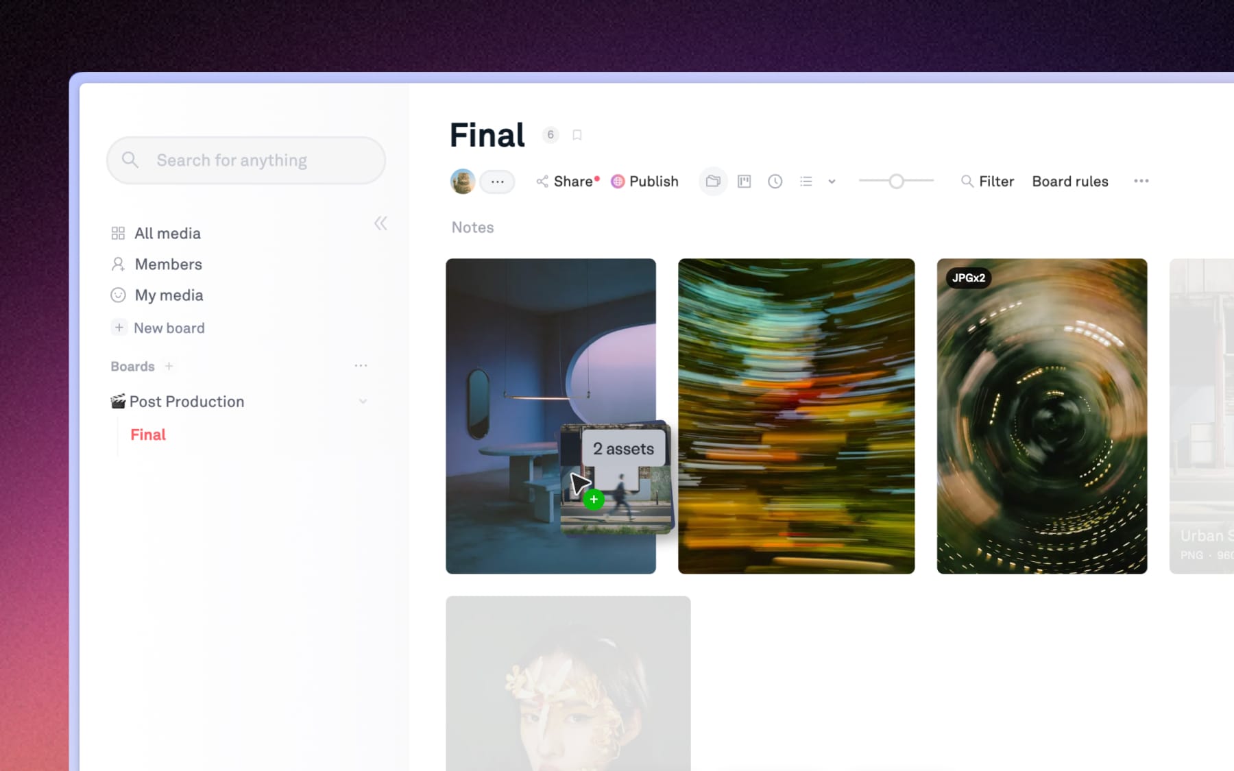 In Playbook, you can Group multiple versions or similar assets together. Think of it like a physical stack of papers: the "Final" version sits on top, while all the previous iterations, or similar shots are tucked underneath. This keeps your board looking clean and tidy while ensuring every file is still accessible.