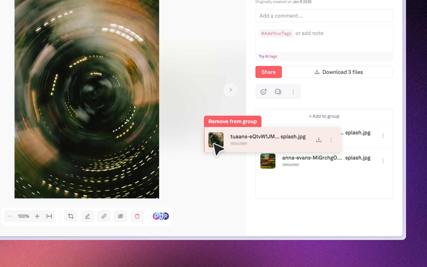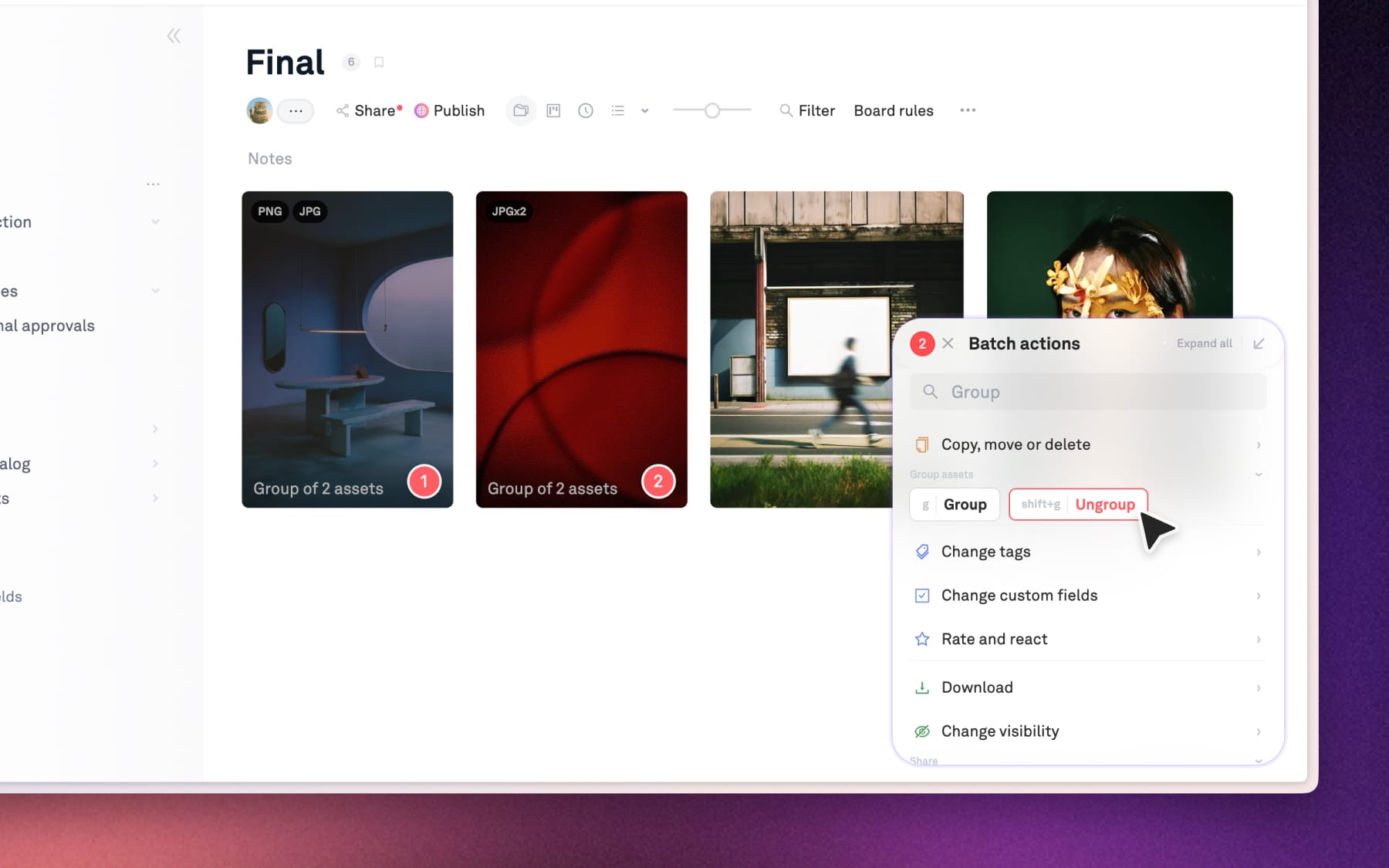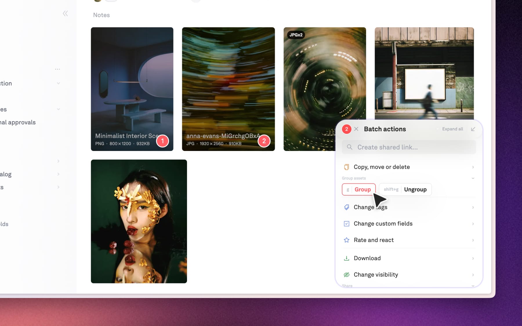 Whether you are organizing one file or hundred, you can create a Group in seconds using drag-and-drop or the Batch actions.
