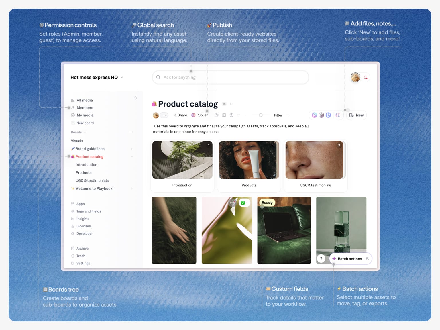- Batch actions – update, manage many assets in one move.