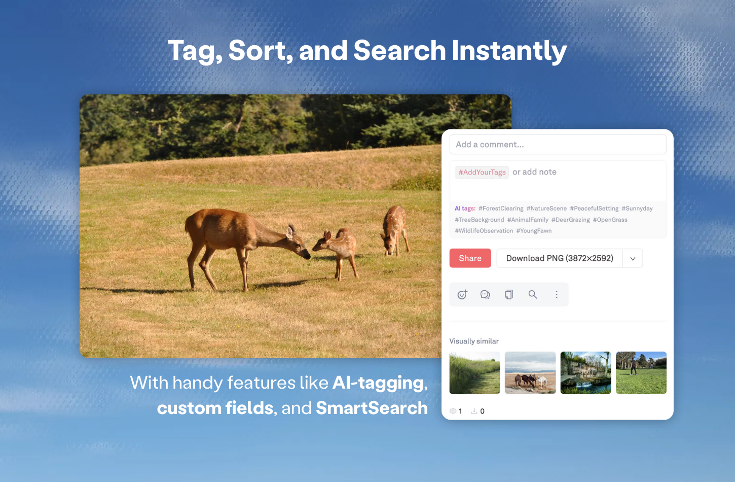 - Tag, sort, and search images instantly using auto-tagging, customizable sorting, and AI-powered smart search.