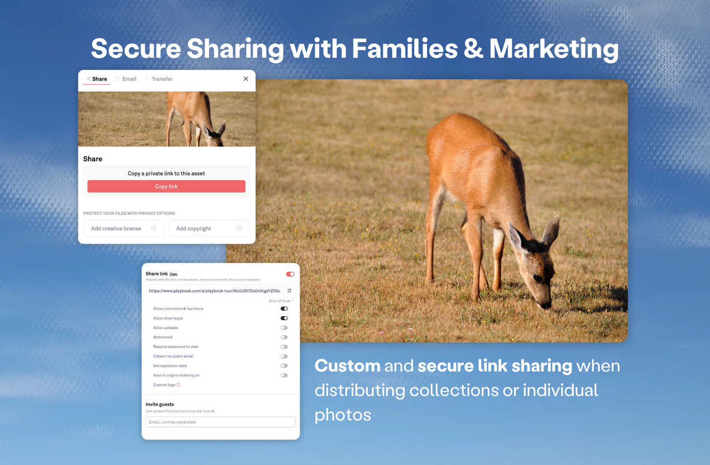 - Secure sharing with families and marketing with customizable secure link sharing, access controls, and other advanced security features when distributing photos.